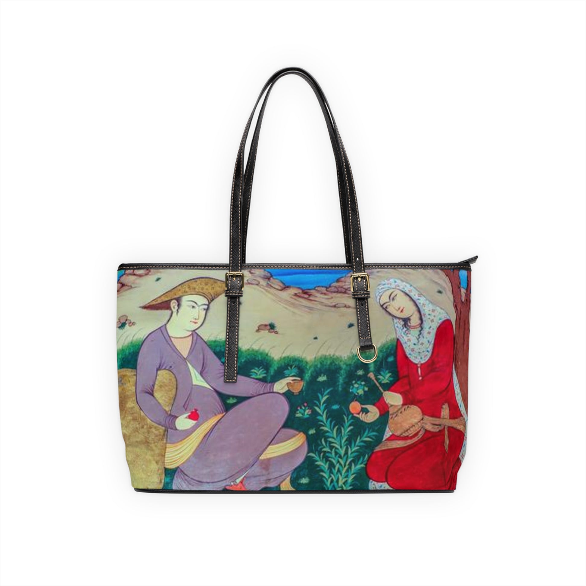 A stylish PU leather shoulder bag featuring a vibrant Iranian miniature family celebration design. Lightweight, artistic, and practical with adjustable handles and multiple pockets. A perfect everyday accessory or a thoughtful gift for art lovers.