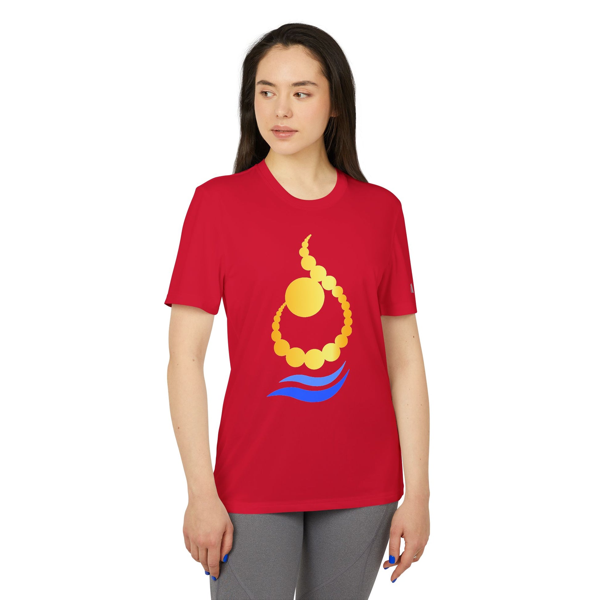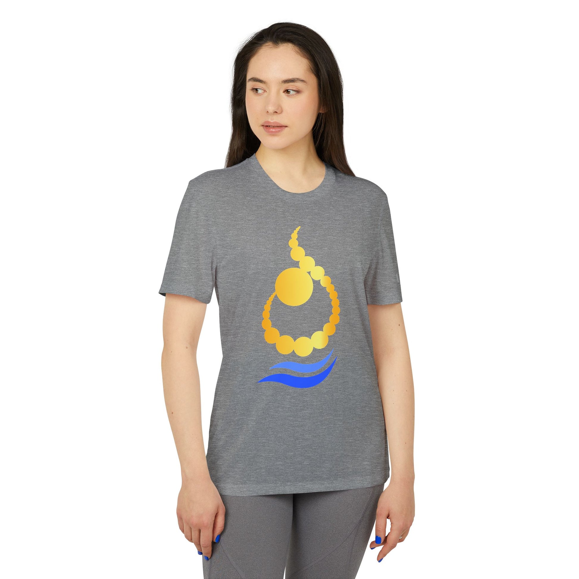 Crafted from 100% recycled polyester, this tee keeps you cool and dry with moisture-wicking technology and UPF 50+ sun protection, making it perfect for morning runs, workouts, or relaxed coastal days. The gold and blue sun-and-wave motif nods to calm energy and open horizons, while the embroidered Arabic letter ن (N) adds personal and cultural meaning.