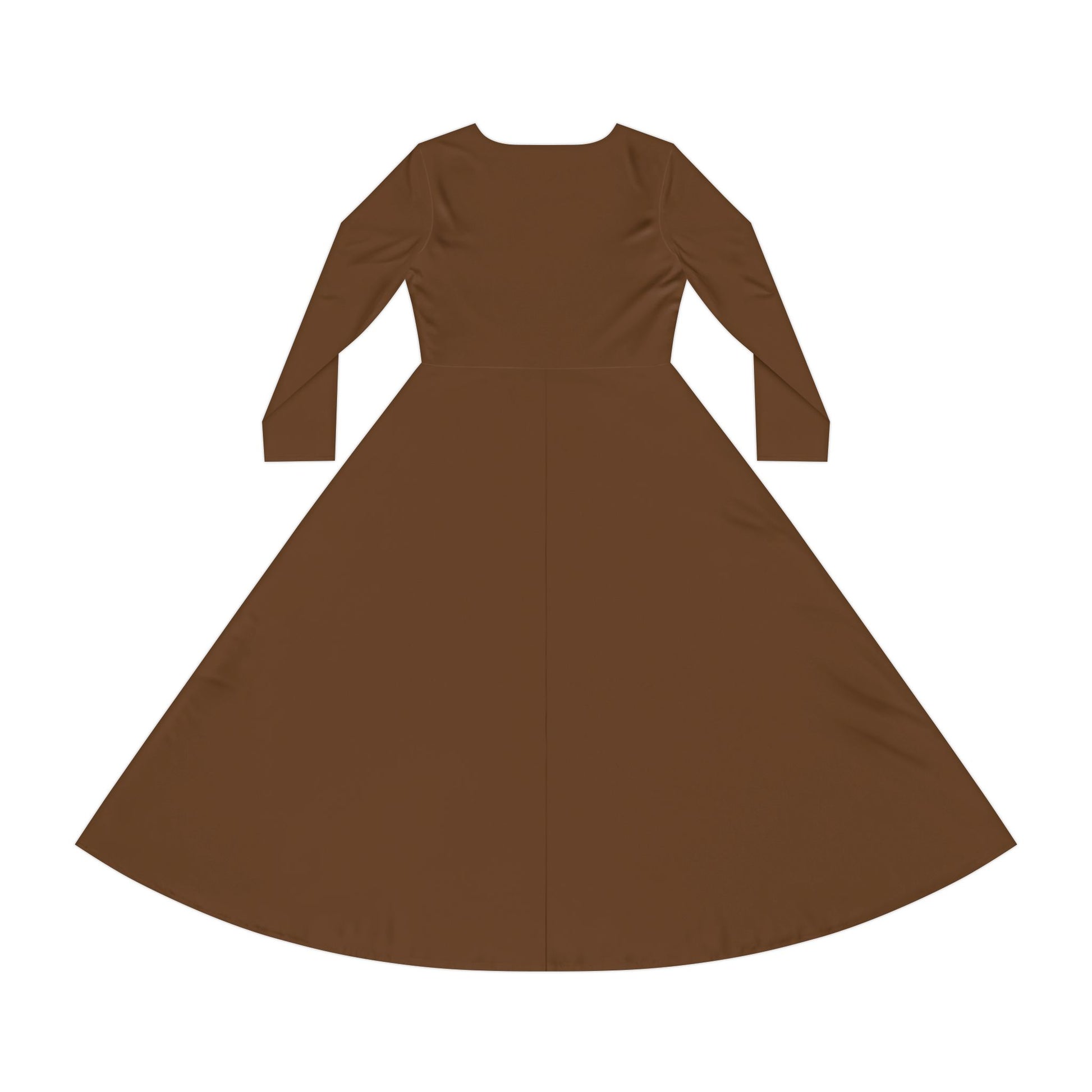 This flowing long-sleeve dress brings soft drama to everyday movement. Lightweight polyester holds a sculpted, high-cut neckline and flares into a generous skirt that catches the turn of a step. The rich brown field is printed with sweeping, gold-tone calligraphic lettering that reads like a quiet poem across the bodice and hem — elegant, expressive, and unmistakably personal. Wear it to slow evenings, cultural gatherings, or days when you want clothing that moves like language. The regular fit and medium-weight fabric make it easy to layer or wear on its own, and the bright, lasting print keeps the design luminous through repeated wear.
