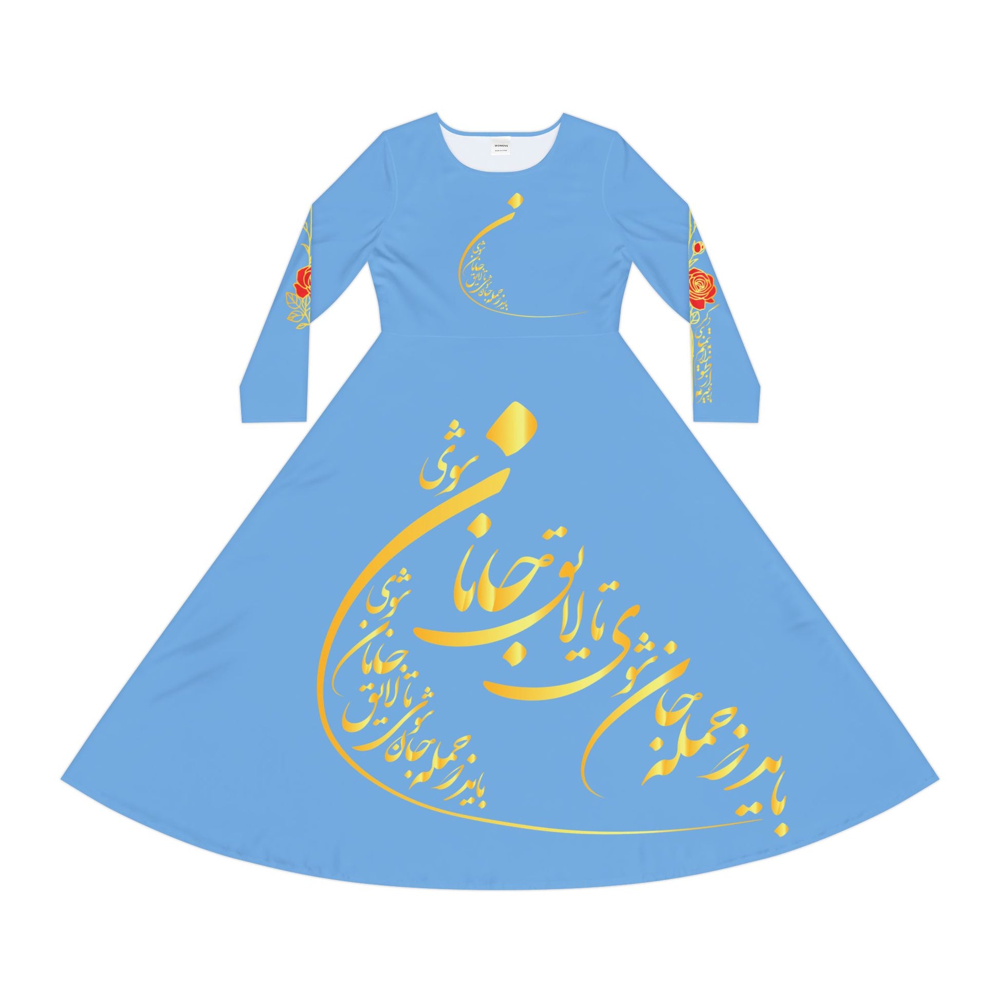 Celebrate movement and meaning with this flowing skater dress, featuring the timeless Persian verse "باید که جمله جان شوی تا لایق جانان شوی" in bold calligraphy. Designed for elegance and comfort, it's perfect for dance, gatherings, or cultural expression.