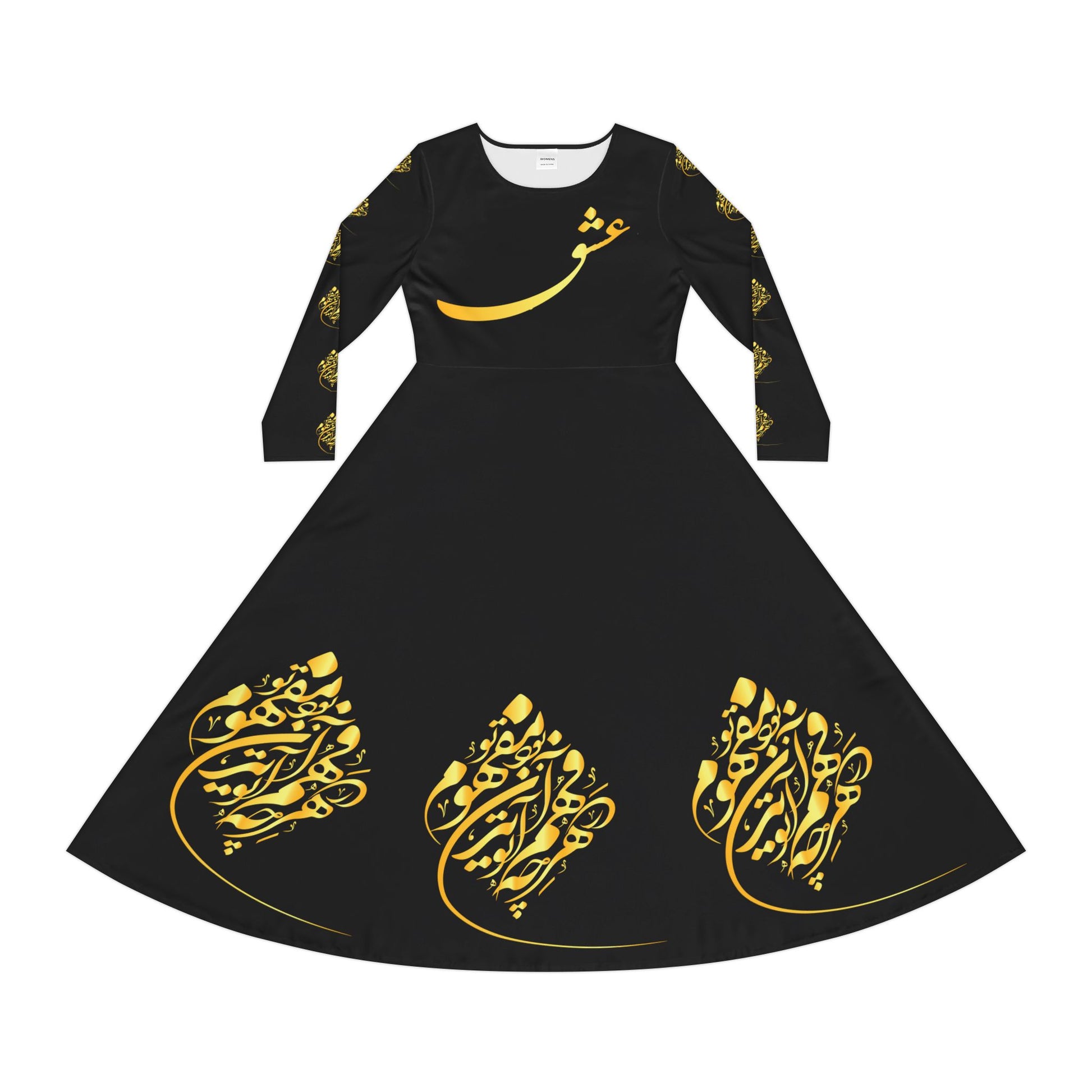 Flowing and elegant, this black long-sleeve dress features golden Persian calligraphy from عطار نیشابوری —