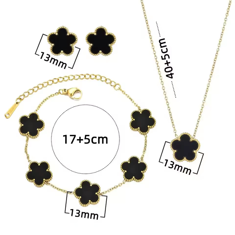 Elevate your style with this stunning 3-piece Plum Blossom Jewelry Set, featuring a matching necklace, bracelet, and optional earrings. Designed with a modern geometric five-leaf blossom motif, this set adds a bold yet feminine touch to any outfit. Perfect for parties, celebrations, birthdays, or gifting someone special.